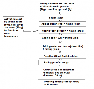 Figure 1 is the schematic for donut dough preparation.2 The dough pieces are then fried in a deep-fat fryer. Frying operation are carried out at 375oF or 190oC. The oil is preheated 1 hour prior to frying to ensure that the oil temperature is stable and constant. Used oil is replaced with fresh oil after four frying batches.