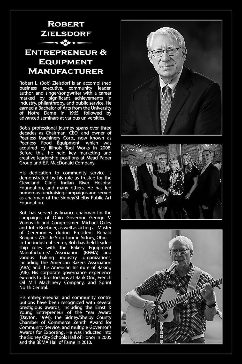 Robert L. (Bob) Zielsdorf is an accomplished business executive, community leader, author, and singer/songwriter with a career marked by significant achievements in industry, philanthropy, and public service. He earned a Bachelor of Arts from the University of Notre Dame in 1965, followed by advanced seminars at various universities.